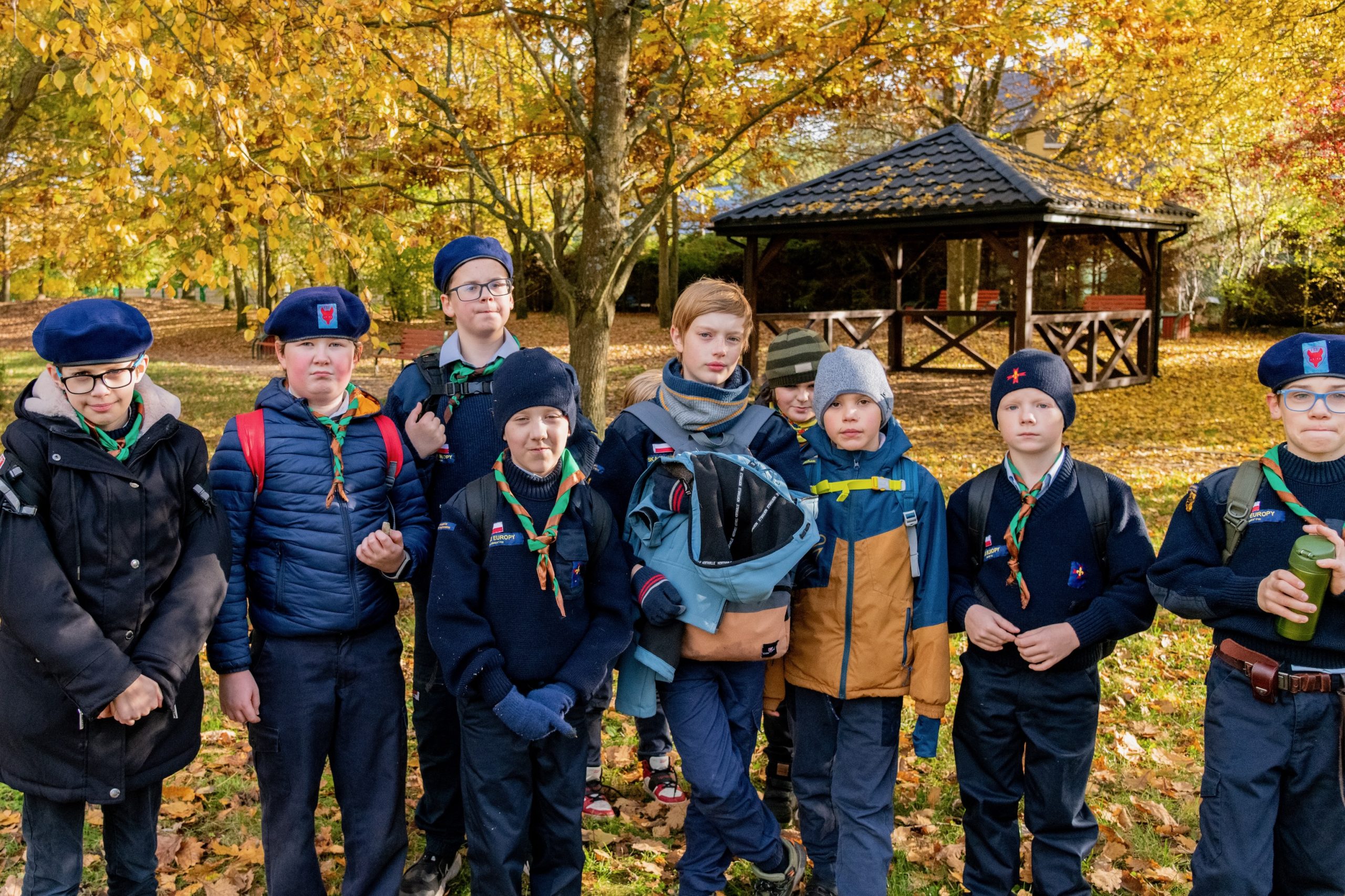 Oczywiście w międzyczasie nie zabrakło zabaw, gier i śmiechu. Na koniec zrobiliśmy wspólne, jesienne zdjęcie – piękne podsumowanie naszej zbiórki w złotym słońcu.